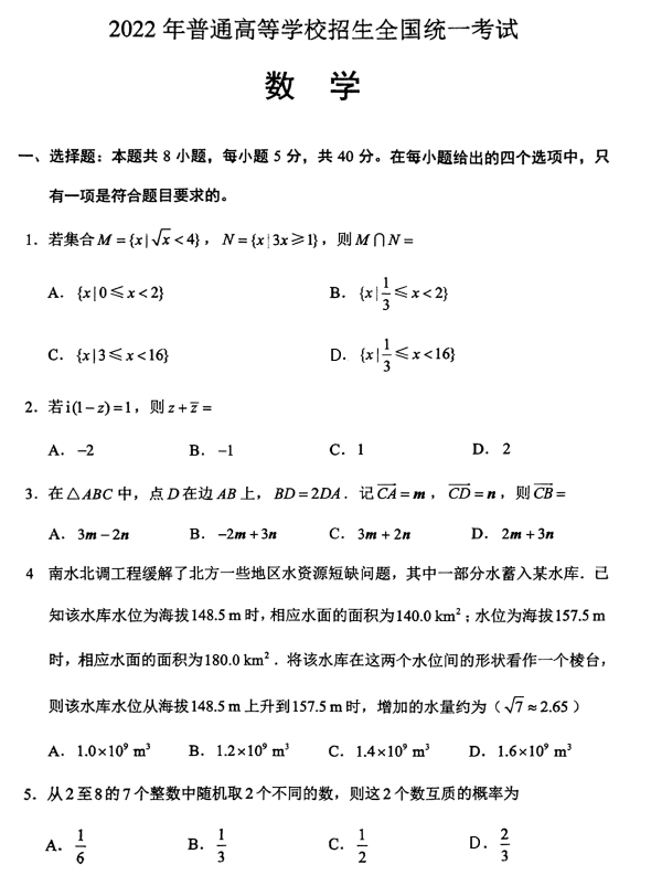 2022年全国新高考Ⅰ卷数学试卷真题及答案